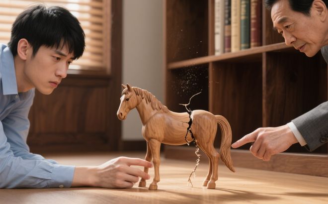 话音未落,清脆的撞击声响起。小张眼睁睁看着书架上的木雕马重重摔在地板上,马腿应声断裂。