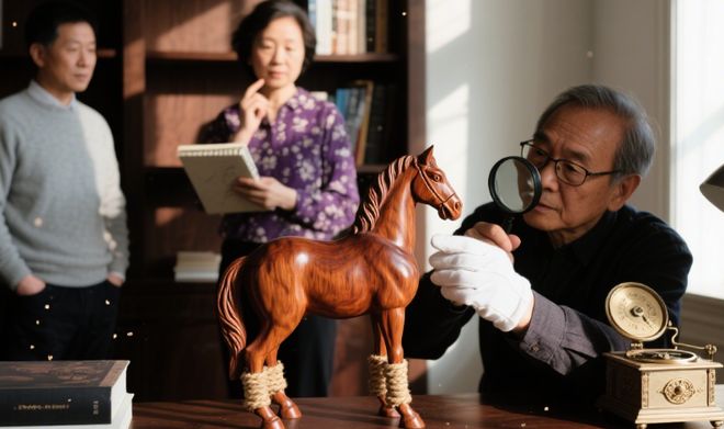几个人一起走向书房。木雕马依然安静地站在书架的第二层,下午的阳光透过窗户洒在它身上,让深褐色的木质显得格外有质感。